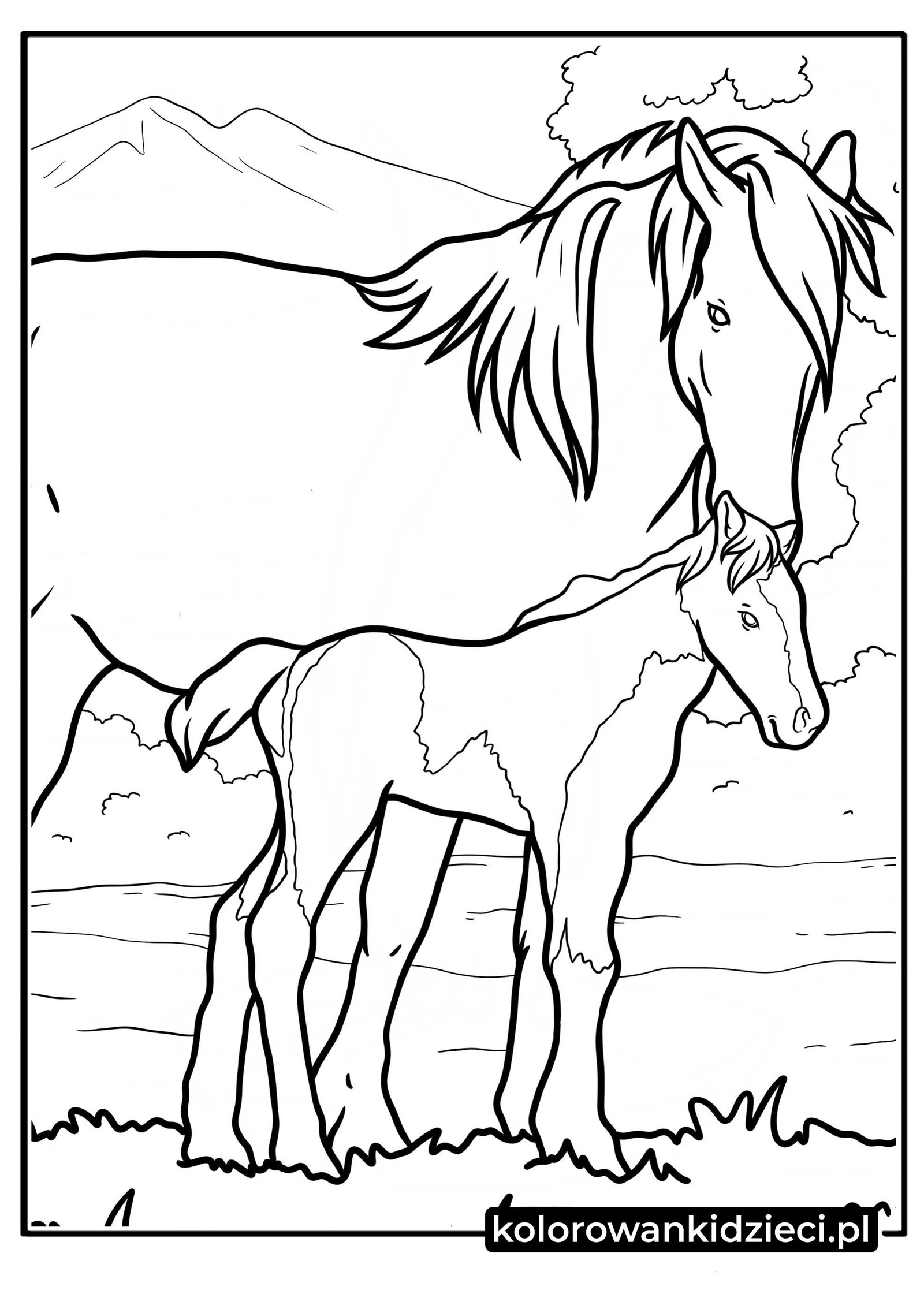 Na pierwszym planie naszej grafiki widzimy małego konika, który stoi dumnie, spoglądając przed siebie. Jego sylwetka wyróżnia się charakterystycznymi łatkami, co daje małemu artyście szansę na stworzenie konia rasy srokatej przy użyciu różnych barw. Tuż za nim znajduje się potężna i opiekuńcza postać matki. Klacz pochyla głowę w stronę swojego maleństwa w geście wsparcia, a jej długa, falująca grzywa opada miękko na kark, dodając postaci wdzięku. To obrazek, który wspaniale rozwija empatię i wyobraźnię u każdego przedszkolaka.